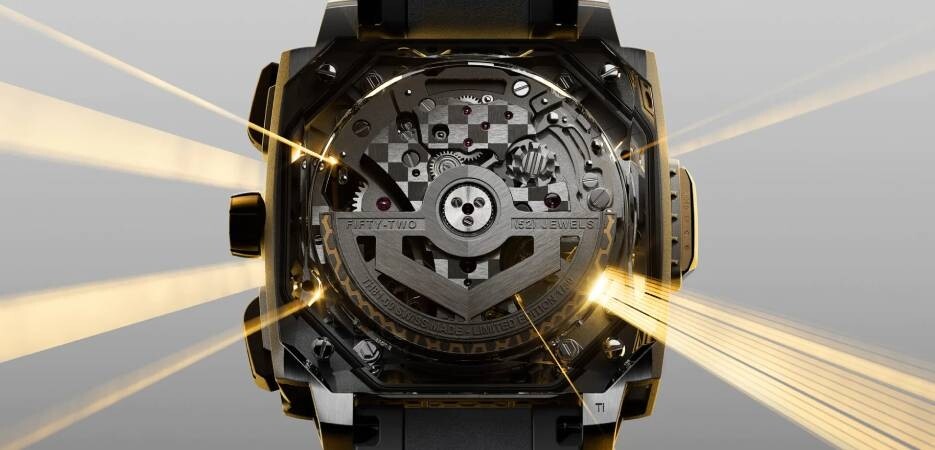 Combined, these then act like a complex exoskeleton that cradles a twin-layered honeycomb-motif mesh that was inspired by the latticed engine covers of hypercars, only that here serve as a movement surround. The case is in Grade-5 titanium, as are the lattices that frame the movement on the caseband, while the lattices under the bezel are laser-cut from gleaming solid 2N yellow gold, the perfect marriage of a precious metal and a high-tech, performant material. The Grade-5 titanium bezel is coated in black DLC, creating a deliberate but balanced contrast that enhances the watch’s assertive profile.
