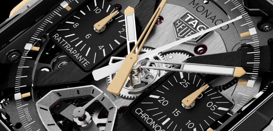 This exceptional case is paired with the most complex chronograph movement in TAG Heuer’s catalog: Calibre TH81-00, a high-frequency automatic movement that equips the TAG Heuer Monaco Split-Seconds Chronograph Air 1 with a rattrapante function.